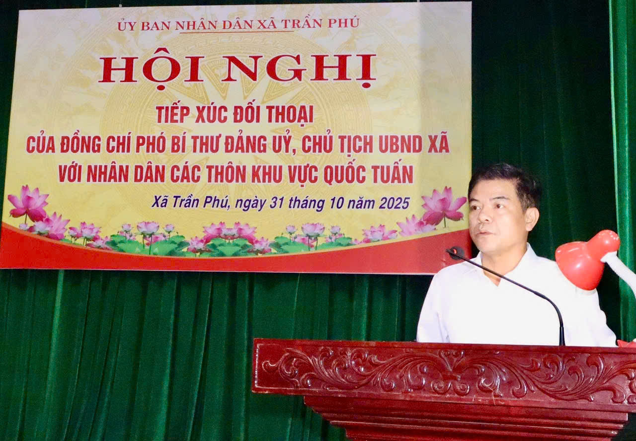 Sáng 31/10, tại hội trường trung tâm xã Trần Phú, đồng chí Vũ Quang Hoàng – Phó Bí thư Đảng ủy, Chủ tịch UBND xã đã chủ trì hội nghị tiếp xúc, đối thoại trực tiếp với nhân dân các thôn Lê Hà, Tống Xá, Tông Phố, Linh Khê, An Xá, Đông Thôn, Lương Gián và Trực Trì (khu vực Quốc Tuấn). Tham dự có đồng chí Phùng Thị Mai Anh – Phó Bí thư Thường trực Đảng ủy xã; các đồng chí Ủy viên Ban Thường vụ Đảng ủy; lãnh đạo HĐND, UBND; đại diện các phòng, ban, trung tâm; lãnh đạo cùng đông đảo cán bộ, đảng viên, hội viên và nhân dân.