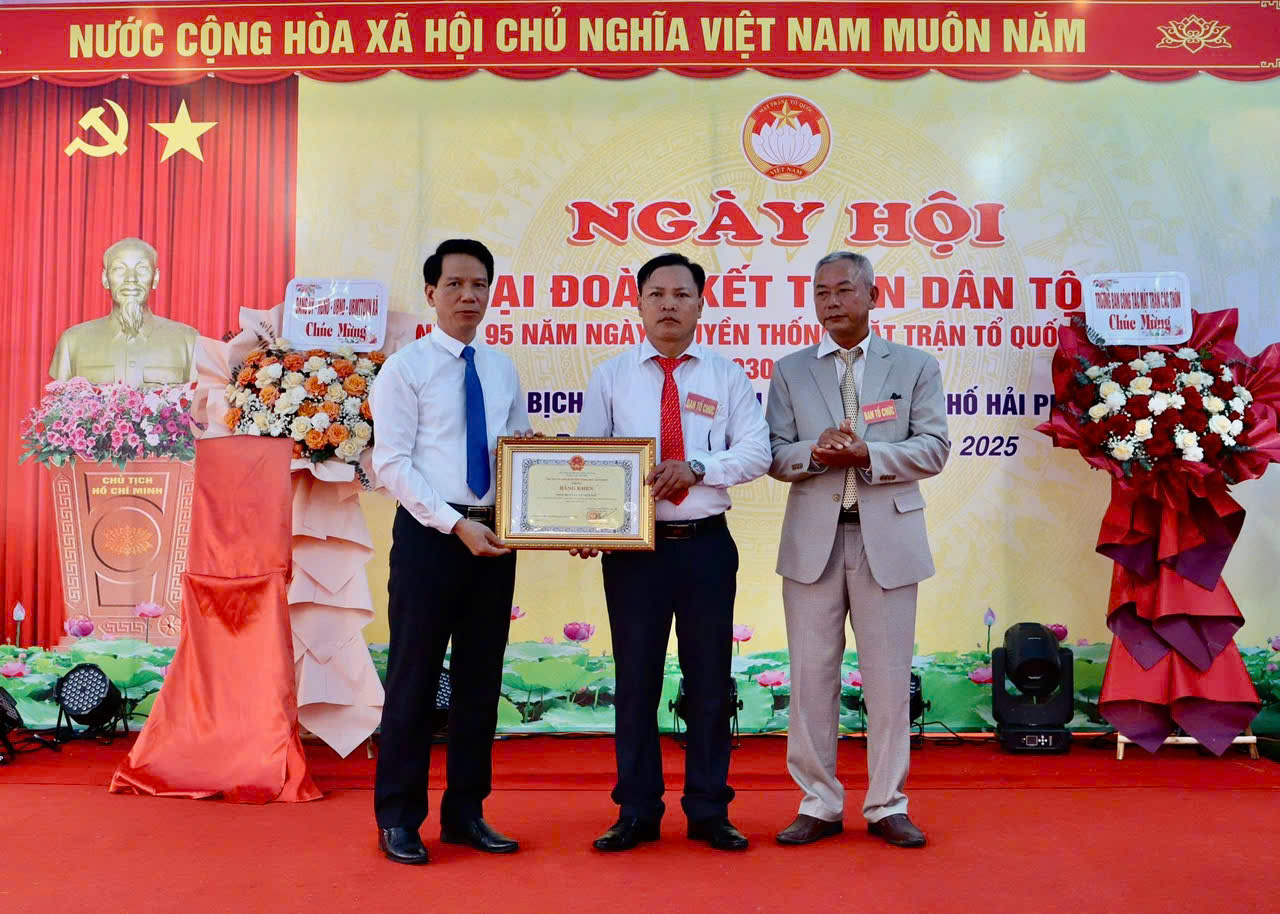 Đồng chí Đồng Xuân Sơn - Bí thư Đảng ủy, Chủ tịch HĐND xã trao bằng khen cho thôn Bịch TâyTại ngày hội, các đại biểu đã cùng nhau ôn lại truyền thống 95 năm Ngày thành lập Mặt trận Dân tộc Thống nhất. Phát huy truyền thống đó, trong những năm qua, tinh thần đại đoàn kết toàn dân tộc đã trở thành động lực mạnh mẽ, giúp thôn Bịch Tây đạt được những thành tựu nổi bật: Cơ cấu kinh tế chuyển dịch tích cực, thu nhập bình quân đầu người tăng lên rõ rệt. Tỷ lệ hộ giàu và khá cao, toàn thôn có 196 hộ giàu (chiếm 59,9%); 69 hộ khá (chiếm 21,2%); còn 2 hộ nghèo (giảm còn 0,6%) và 4 hộ cận nghèo (giảm còn 1,2%).