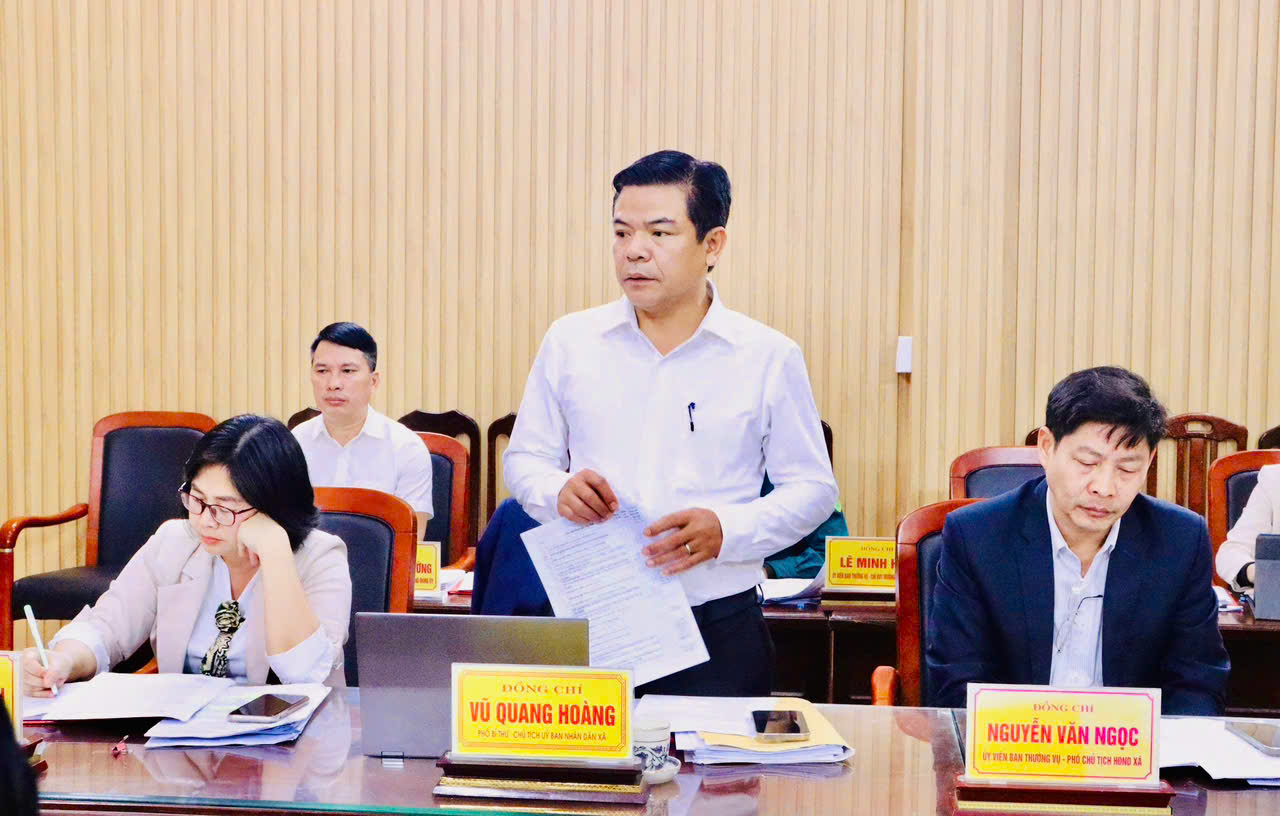 Đồng chí Vũ Quang Hoàng - Chủ tịch UBND xã phát biểu tại hội nghịCũng trong sáng ngày 17/12, ngay sau hội nghị kiểm điểm tập thể, từng cá nhân đồng chí trong Ban Thường vụ Đảng ủy xã cũng tiến hành kiểm điểm, đánh giá, xếp loại cá nhân năm 2025.