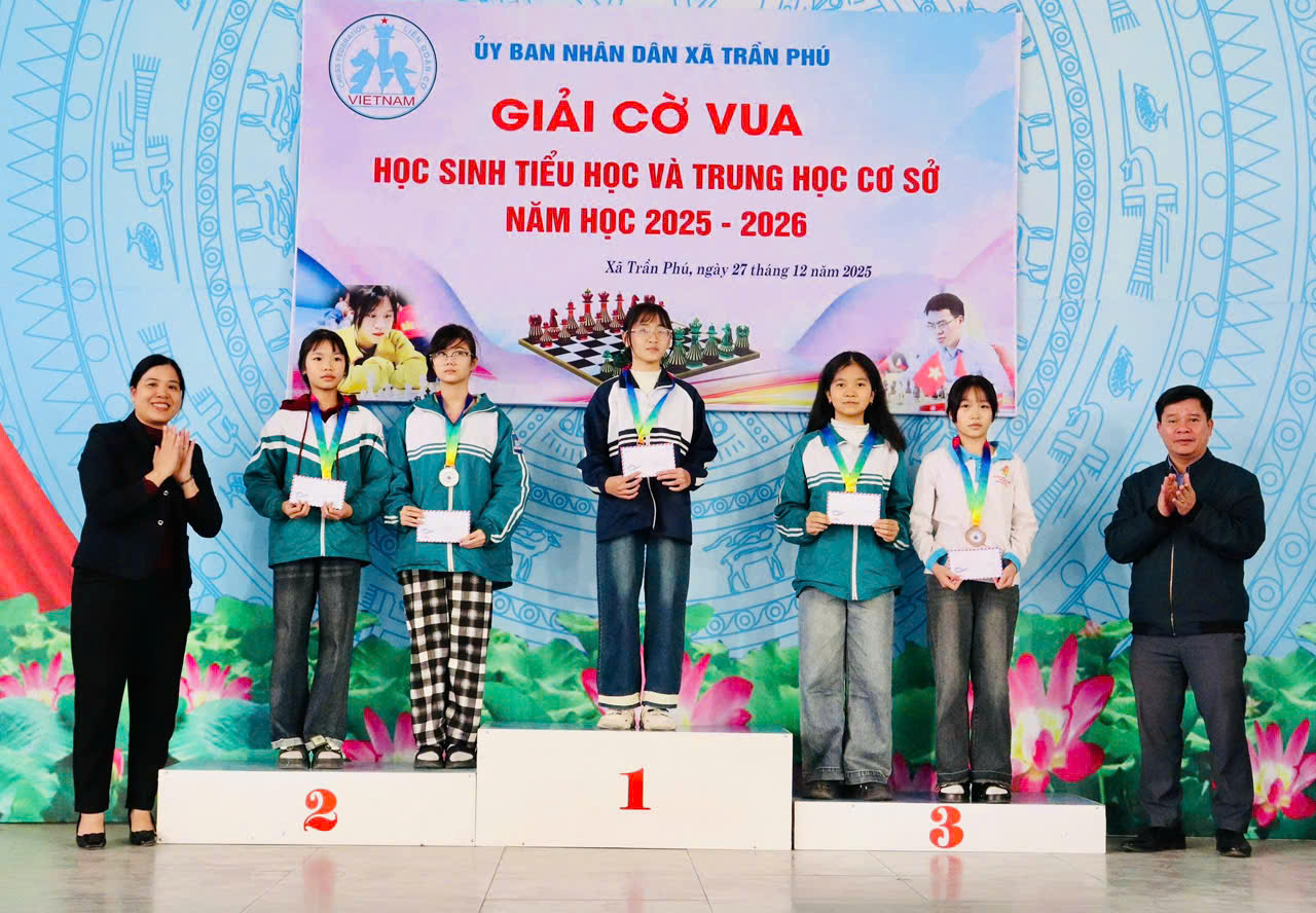 Trao Huy chương cho các kỳ thủ xuất sắcKhối THCS (Lớp 6, 7): Bảng Nữ: Em Trần Ngọc Linh (THCS Nam Trung) xuất sắc giành HCV. HCB thuộc về em Lê Kim Ngân (THCS Quốc Tuấn) và em Nguyễn Quỳnh Phương (TH&THCS Thanh Quang); HCĐ thuộc về em Phạm Lê Phương Thảo (THCS Quốc Tuấn) và em Đặng Vân Khánh (TH&THCS Nam Chính). Bảng Nam: HCV thuộc về em Trần Quang Minh (TH&THCS Thanh Quang); HCB thuộc về em Trần Quang Vinh (THCS Quốc Tuấn) và em Vũ Phúc Tùng (TH&THCS Nam Chính); HCĐ thuộc về em Nguyễn Mạnh Tiến (THCS Hiệp Cát) và em Nguyễn Hữu Hoàng Sơn (THCS Quốc Tuấn).