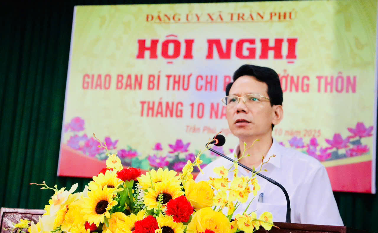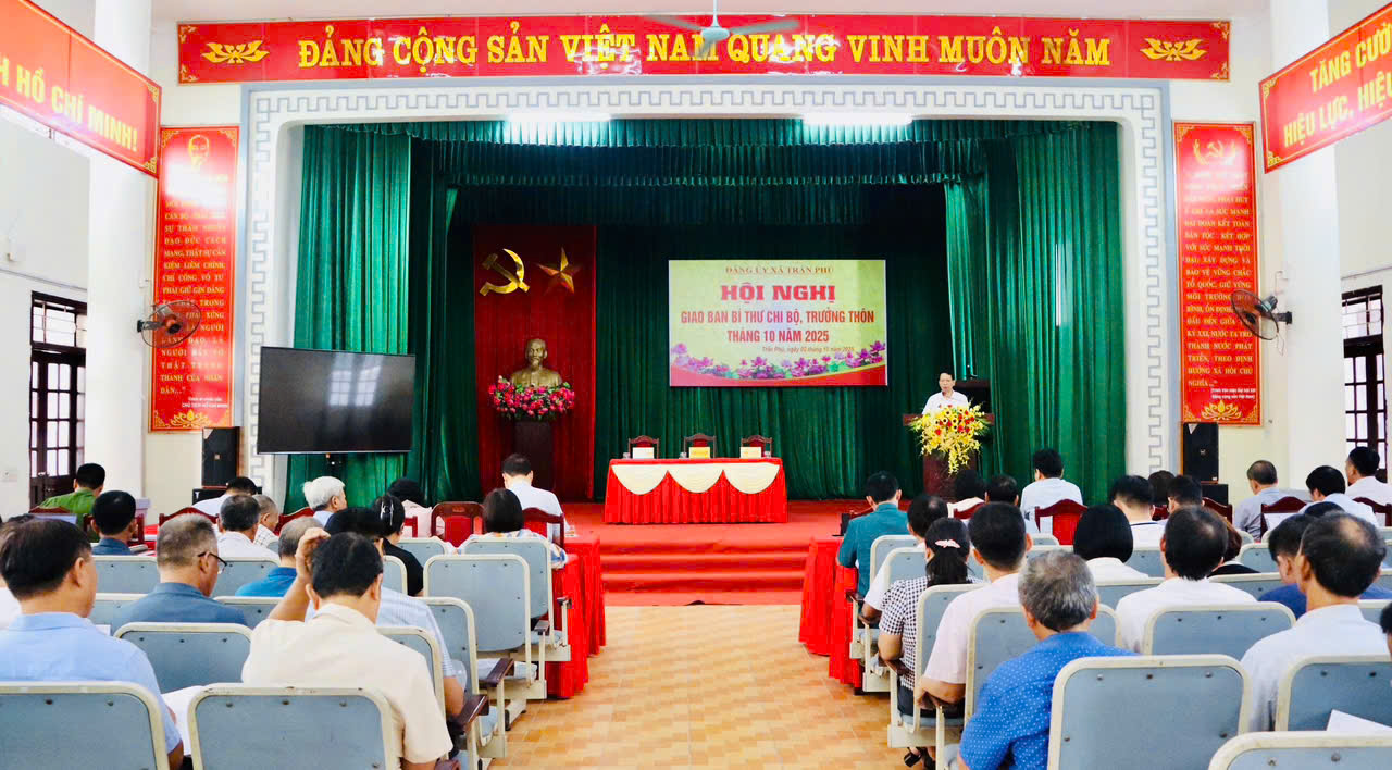 Sáng ngày 2/10, Ban Thường vụ Đảng ủy xã Trần Phú đã tổ chức Hội nghị giao ban với Bí thư chi bộ, Trưởng thôn nhằm đánh giá kết quả thực hiện nhiệm vụ tháng 9 và triển khai nhiệm vụ trọng tâm trong tháng 10/2025. Hội nghị do đồng chí Đồng Xuân Sơn - Bí thư Đảng ủy, Chủ tịch HĐND xã; đồng chí Phùng Thị Mai Anh - Phó Bí thư Thường trực Đảng ủy và đồng chí Vũ Quang Hoàng - Phó Bí thư Đảng ủy, Chủ tịch UBND xã đồng chủ trì.