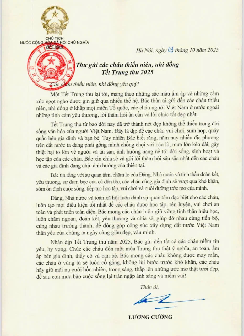 Chủ tịch nước Lương Cường gửi Thư chúc Tết Trung thu 2025 tới các cháu thiếu niên, nhi đồng.