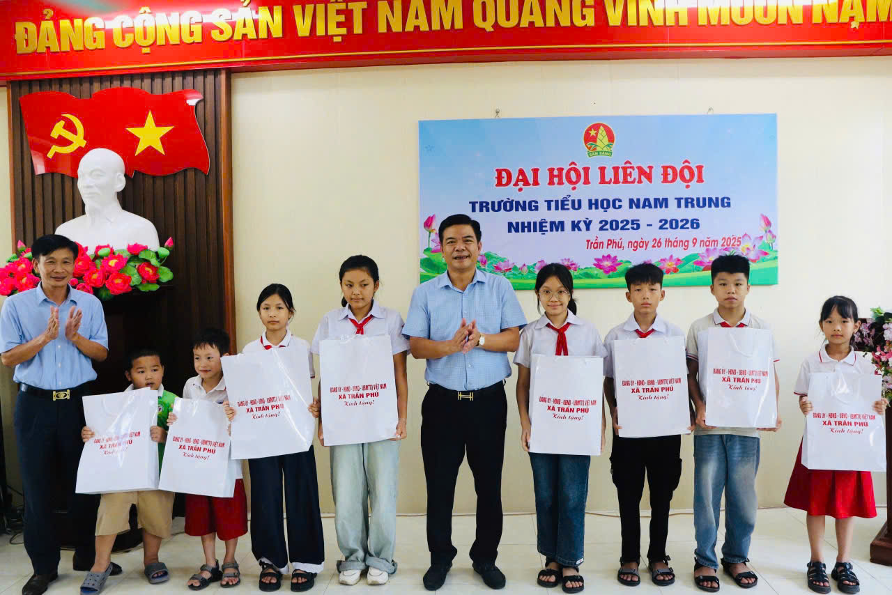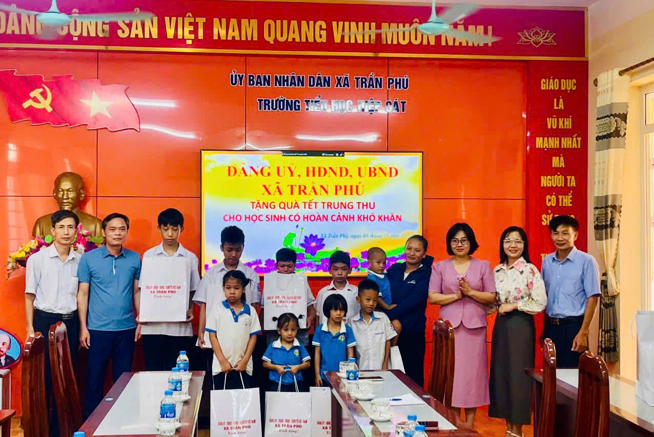 Đồng chí Phùng Thị Mai Anh - Phó Bí thư Thường trực Đảng ủy trao quà cho các cháu thiếu nhiCũng trong ngày 3/10, đồng chí Đồng Xuân Sơn – Bí thư Đảng ủy, Chủ tịch HĐND xã đã đến thăm, tặng quà cho 7 học sinh nghèo, khuyết tật, có hoàn cảnh khó khăn của Trường Tiểu học Quốc Tuấn và 14 em của Trường Tiểu học, THCS Thanh Quang. Đồng chí Phùng Thị Mai Anh – Phó Bí thư Thường trực Đảng ủy xã đã trao quà cho 9 học sinh Trường Tiểu học Hiệp Cát và 12 học sinh Trường Tiểu học, THCS Nam Chính. Đồng chí Vũ Quang Hoàng – Chủ tịch UBND xã tặng quà cho 11 em học sinh Trường Tiểu học Nam Trung.